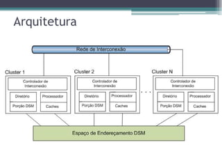 O documento discute memória compartilhada distribuída (DSM), comparando-a com troca de mensagens. Apresenta modelos de programação, algoritmos, consistência de dados e desafios de cada abordagem.