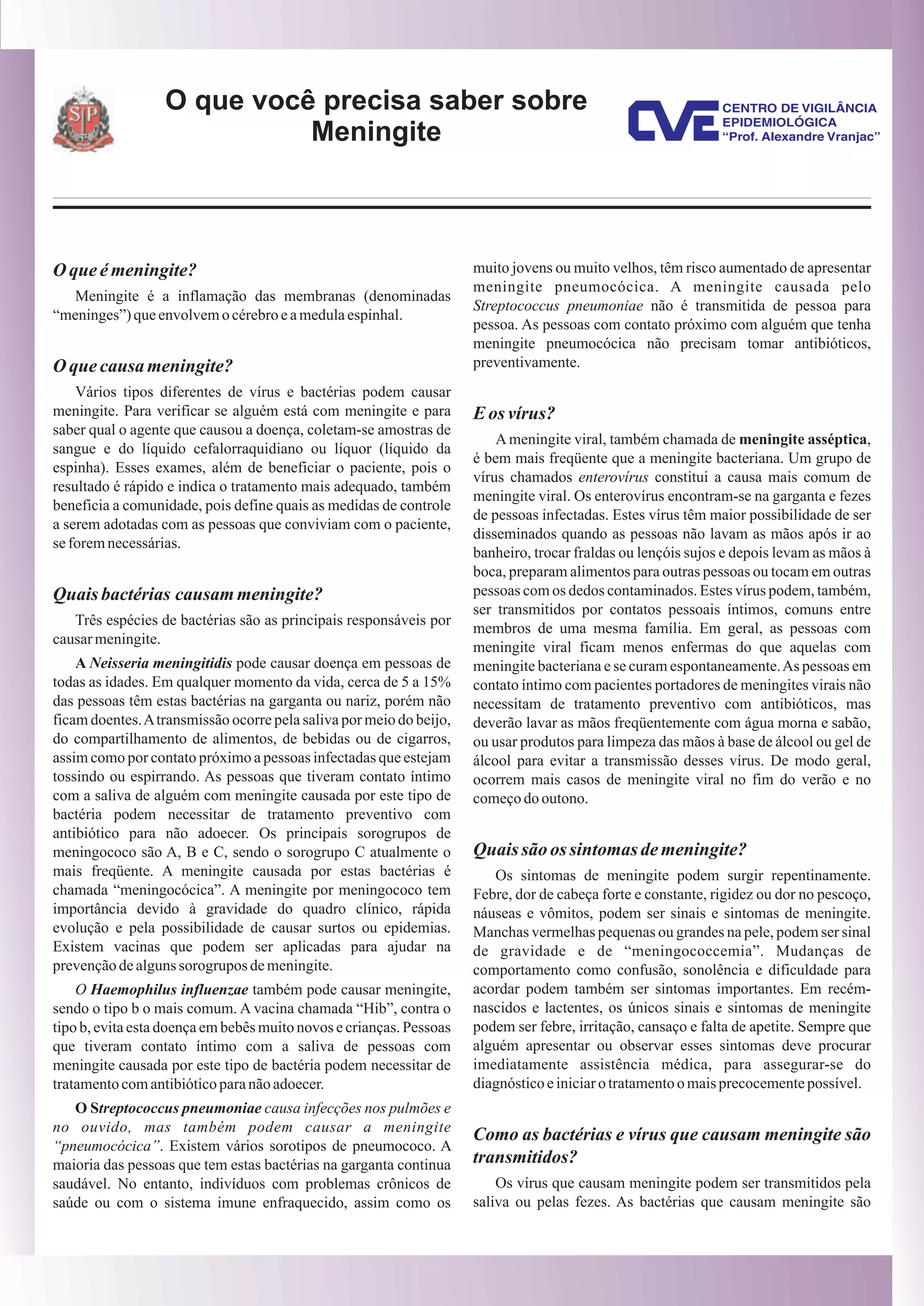 Este documento fornece informações sobre meningite, incluindo o que é meningite, quais bactérias e vírus causam meningite, como é transmitida, sintomas, tratamento, prevenção e colaboração da população. Vacinas podem ajudar na prevenção de alguns tipos de meningite bacteriana. É importante procurar atendimento médico imediato se suspeita de meningite.
