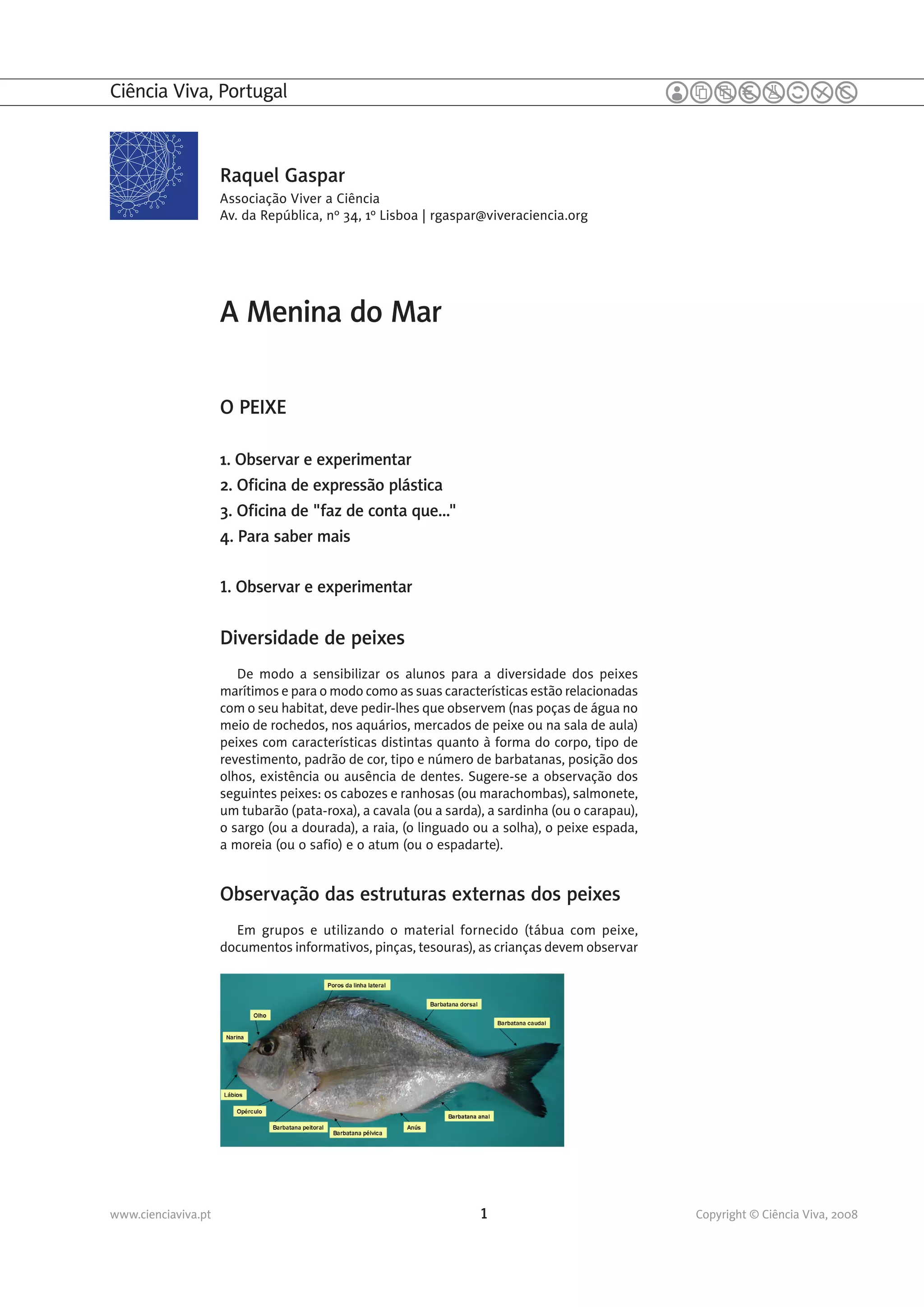 Este documento fornece instruções para uma oficina sobre peixes para crianças. Inclui sugestões para observações de peixes vivos e mortos para identificar características externas e internas. Também sugere atividades práticas como construção de modelos de peixes e dramatizações para explorar como os peixes se movem e vivem nos oceanos.