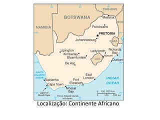 A África do Sul sediou a Copa do Mundo de 2010, com pontos turísticos, fauna e flora diversas e estádios construídos para o evento. O documento apresenta detalhes sobre o país anfitrião, incluindo sua localização, moeda, mascote e aspectos culturais.