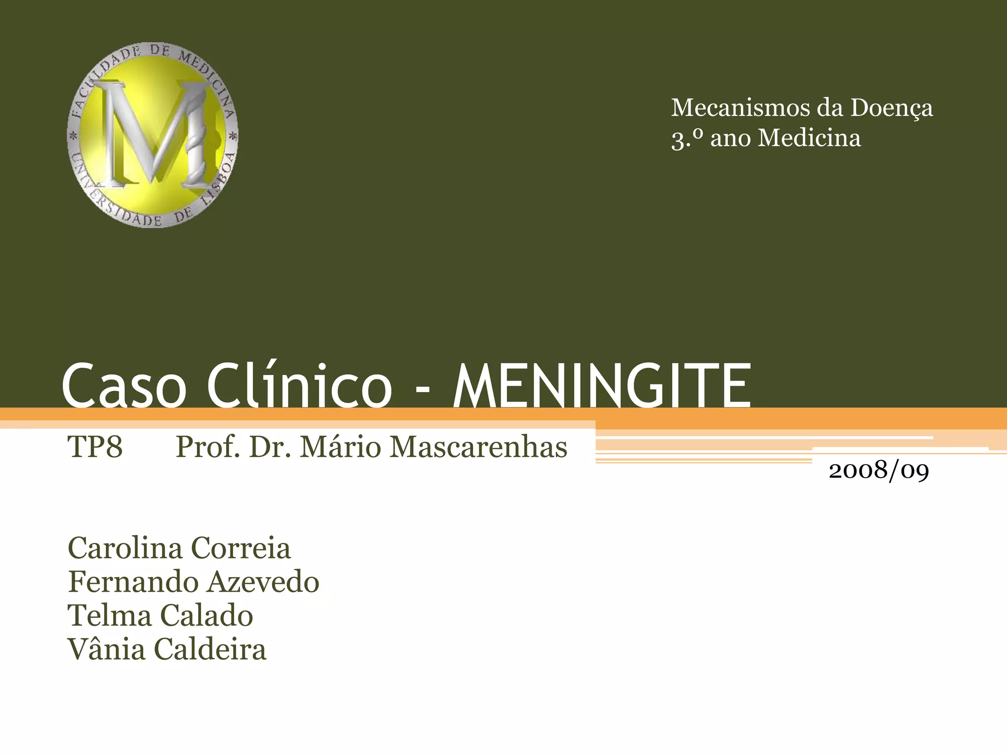 O documento aborda um caso clínico de meningite pneumocócica em um bebê de 10 meses, apresentando análises laboratoriais que confirmam a infecção por Streptococcus pneumoniae. Discute a fisiopatologia e as manifestações clínicas da meningite, bem como a importância de iniciar a terapia antibiótica imediata e o uso de corticosteroides para redução da mortalidade e sequelas neurológicas. Além disso, menciona estudos experimentais relevantes sobre o tratamento e a prevenção de complicações na meningite bacteriana.