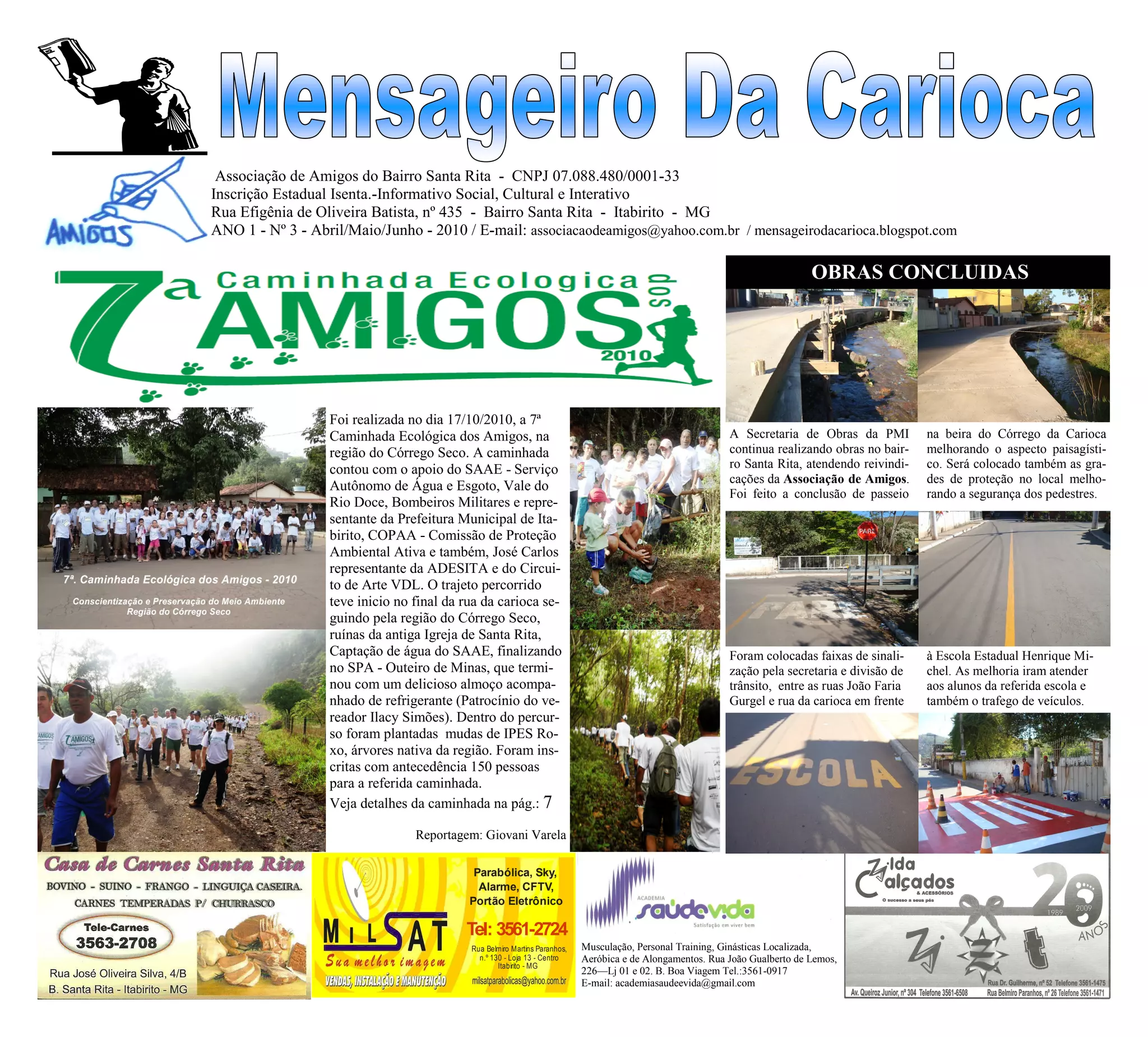 O documento resume as principais informações de um informativo de uma associação de bairro, incluindo: 1) Obras realizadas no bairro como conclusão de passeios e sinalizações; 2) Eventos realizados como caminhadas ecológicas; 3) Serviços oferecidos por empresas da região.