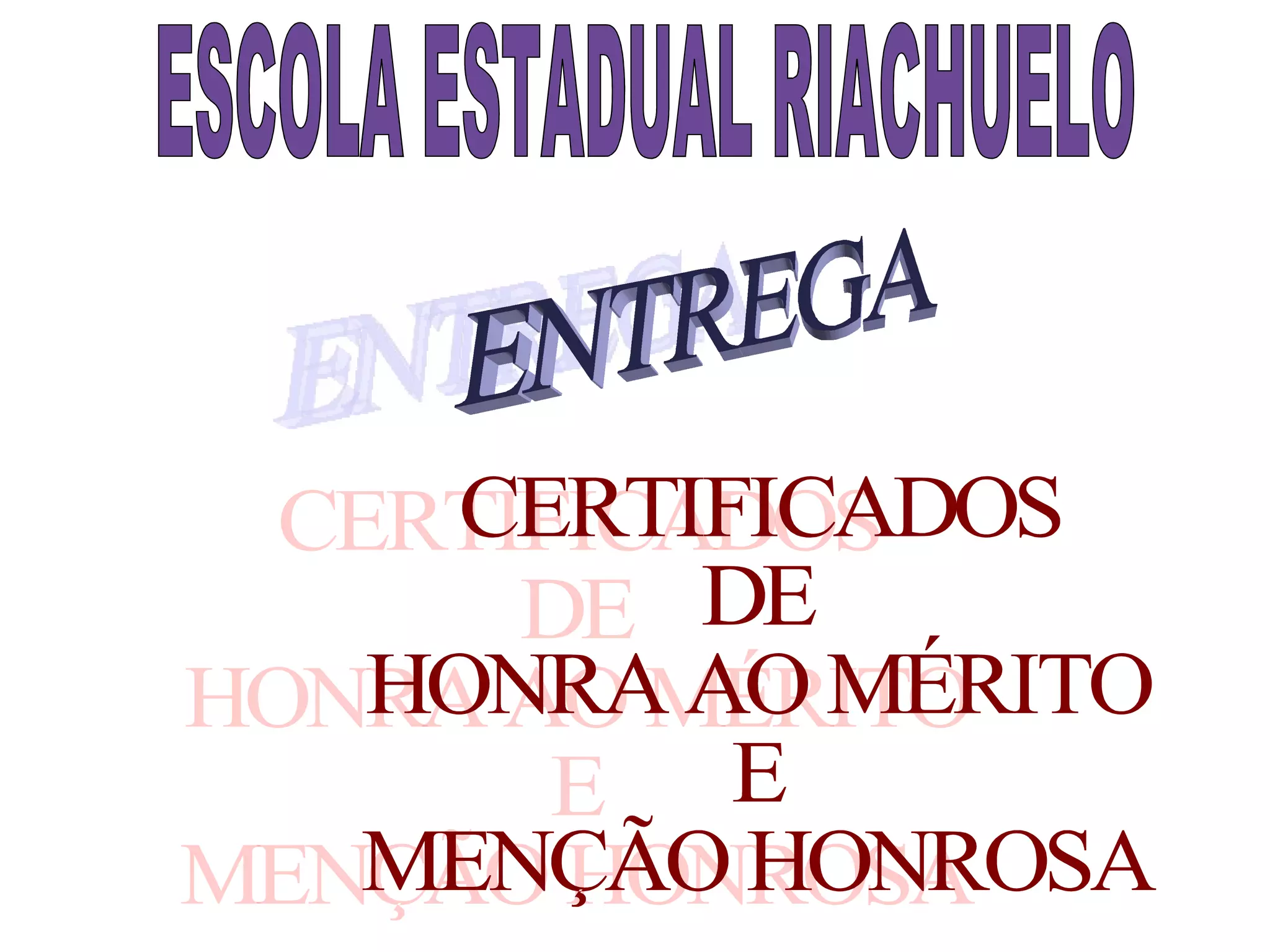 O documento reconhece e parabeniza alunos exemplares da Escola Estadual Riachuelo. Alunos receberam Certificados de Honra ao Mérito por notas acima de 6,0 em todas as disciplinas ou Menção Honrosa por aprovação em todas as disciplinas no 3o bimestre. O texto enaltece as qualidades dos alunos premiados e incentiva a continuação dos estudos.