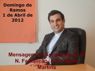 O documento é uma mensagem do Arcipreste de V. N. Famalicão, o P.e Mário Martins, para o Domingo de Ramos em 1 de Abril de 2012, provavelmente sobre o significado religioso da data.