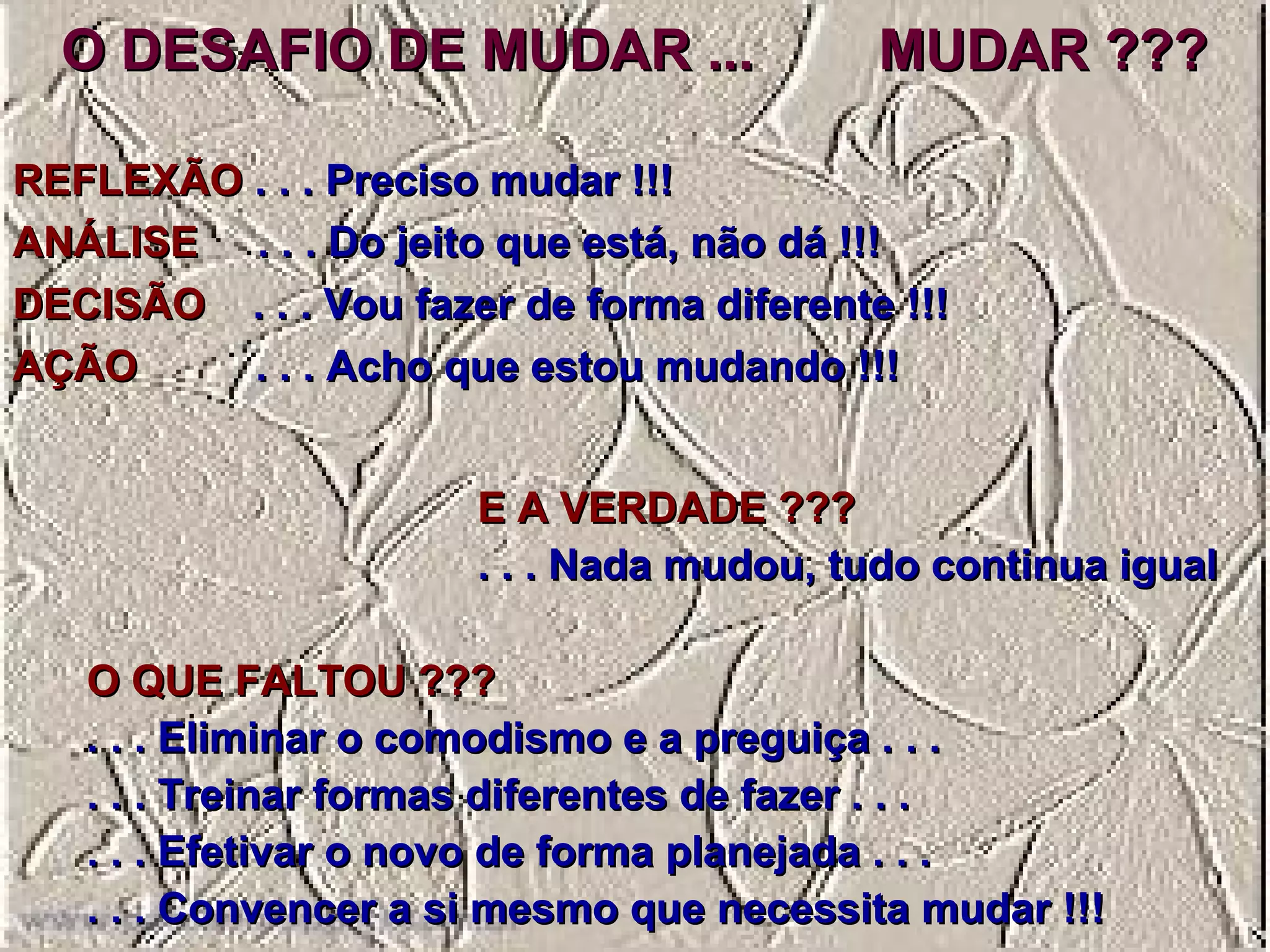 O documento discute a necessidade de mudança, mas reconhece que é difícil mudar de fato. Apesar de reflexão e decisão de agir diferente, na verdade nada mudou. Para ter sucesso, é necessário eliminar hábitos negativos, treinar novas formas de fazer as coisas, e implementar mudanças de forma planejada e convincente.