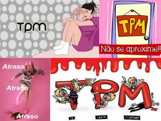 A TPM éuma desordem disfórica pré-menstrual e tem atingido a maior parte da população feminina que pode ser explicado por causas hormonais.TEM COMO SINTOMAS: Depressão, ansiedade, fadiga, dificuldade para se concentrar, dor de cabeça e musculares, choro fácil, diminuição dos interesses por coisas feitas no dia-dia como: assistir, passear... são alguns dos sintomas.
