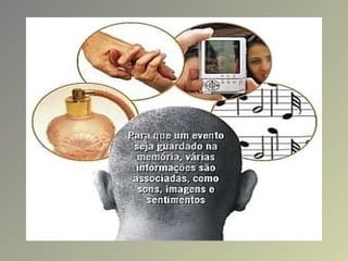 O documento discute os processos cognitivos associados à mente humana, incluindo a percepção, memória e aprendizagem. A percepção envolve a aquisição e interpretação de informações dos sentidos. A memória consiste em codificação, armazenamento e recuperação da informação. Existem diferentes tipos de memória de curto e longo prazo. A aprendizagem pode ocorrer por condicionamento, observação ou uso de símbolos.