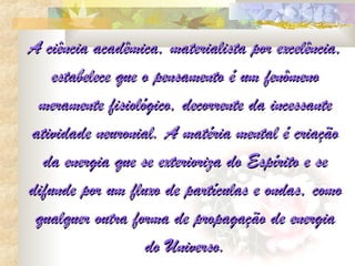 A ciência acadêmica,materialista por excelência, estabelece que o pensamento é um fenômeno meramente fisiológico, decorrente da incessante atividade neuronial. A matéria mental é criação da energia que se exterioriza do Espírito e se difunde por um fluxo de partículas e ondas, como qualquer outra forma de propagação de energia do Universo.