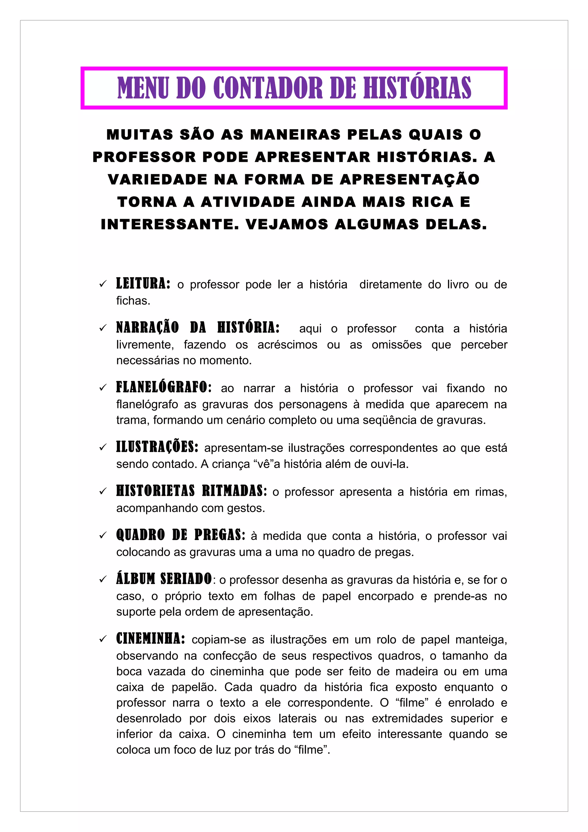 O documento lista diversas maneiras de apresentar histórias para crianças em sala de aula, incluindo leitura, narração, uso de flanelógrafo, ilustrações, fantoches, teatro de sombras, entre outros. O objetivo é tornar a atividade mais rica e interessante variando a forma de apresentação.