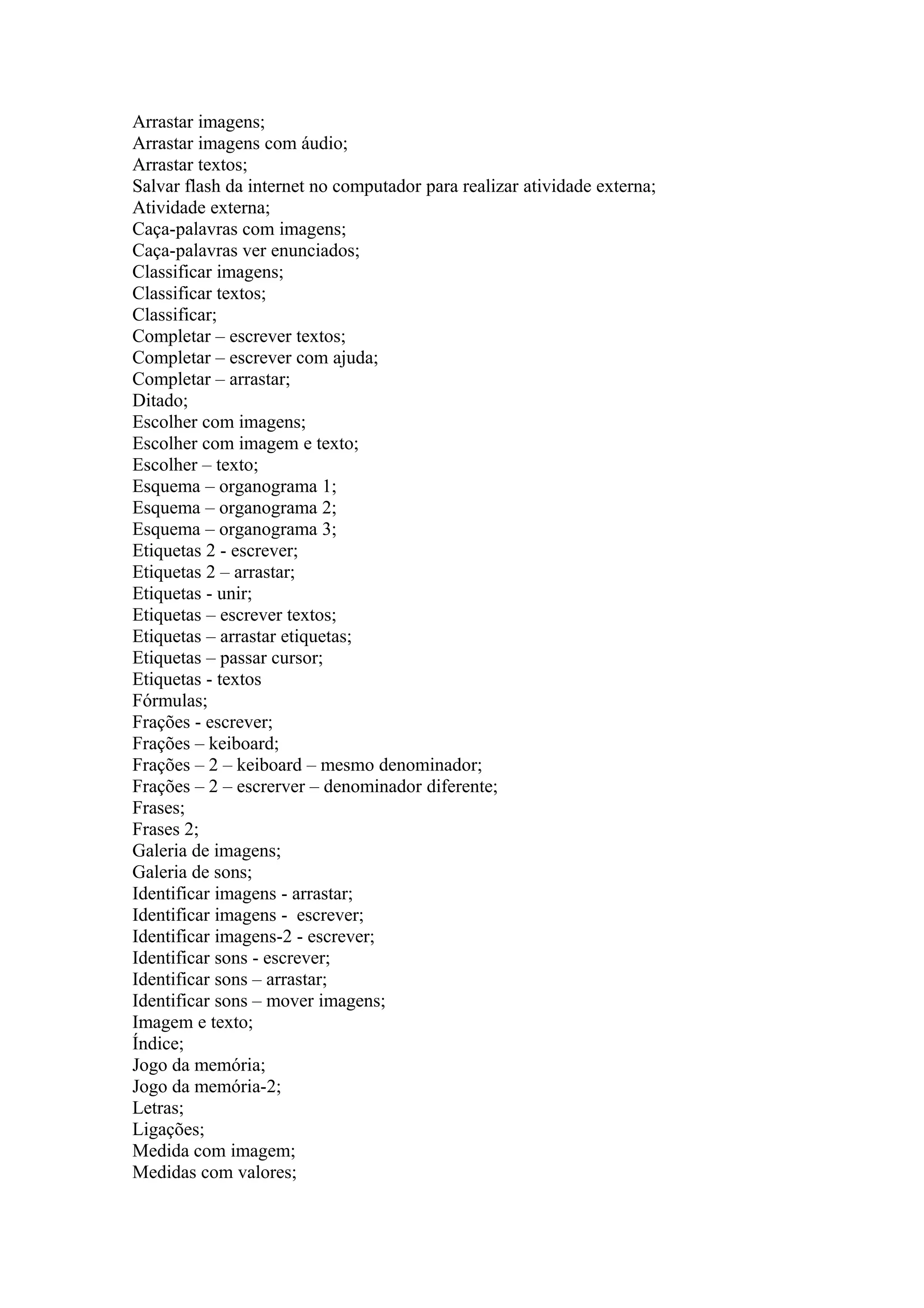 Este documento lista diversas atividades e ferramentas interativas que podem ser usadas em um ambiente de aprendizagem online, incluindo arrastar e soltar imagens, áudios e textos, preencher lacunas, jogos, classificação, emparelhar, quebra-cabeças e mais.