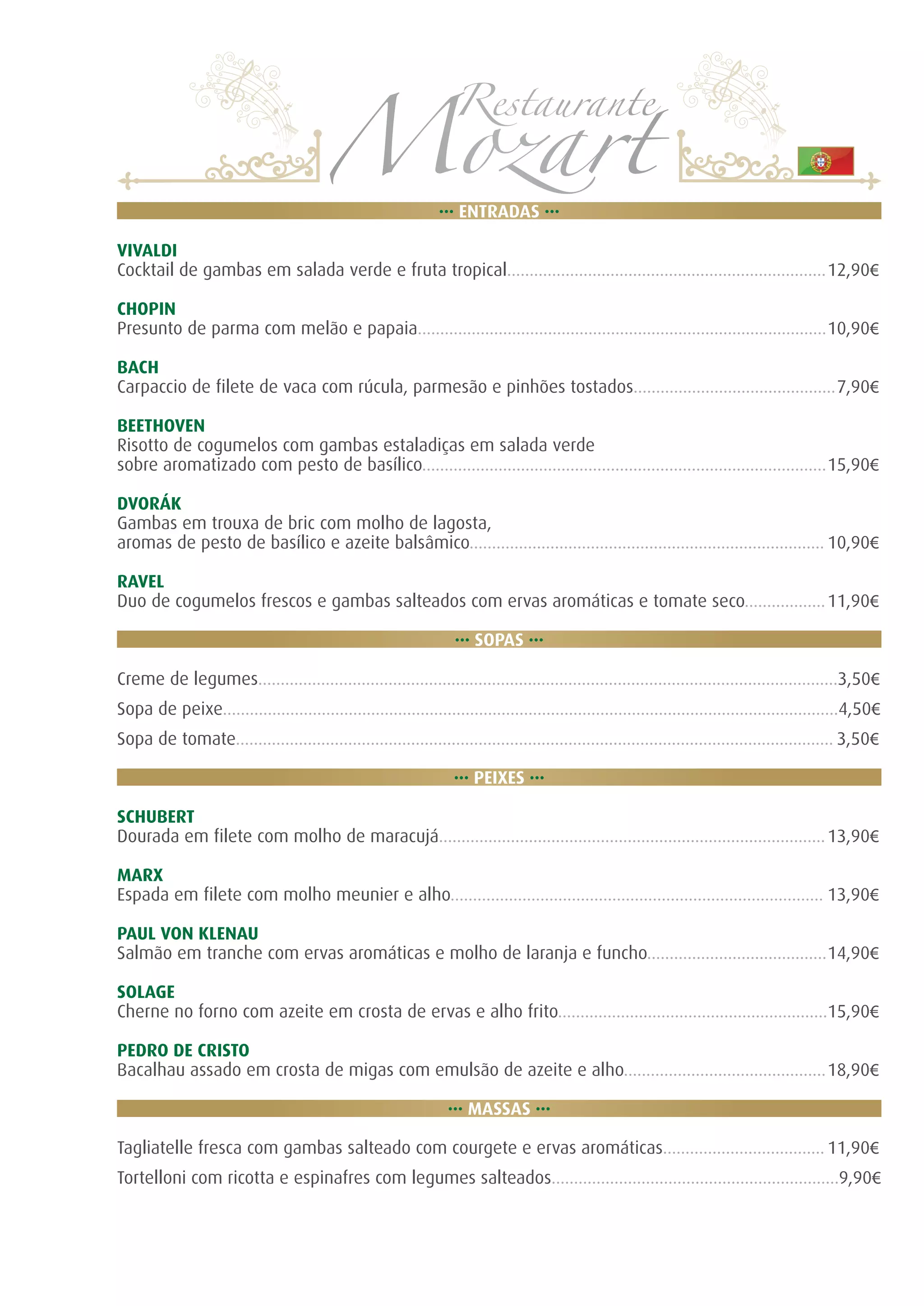 O documento apresenta o menu de um restaurante dividido em entradas, sopas, peixes, massas, carnes e sobremesas. As entradas incluem pratos como cocktail de gambas e salada ou carpaccio de vaca. Nas carnes destacam-se pratos como bife do filete ou borrego. Há também uma seção de sabores italianos com entradas como carpaccio de polvo ou bacalhau e pratos como robalo ou borrego.