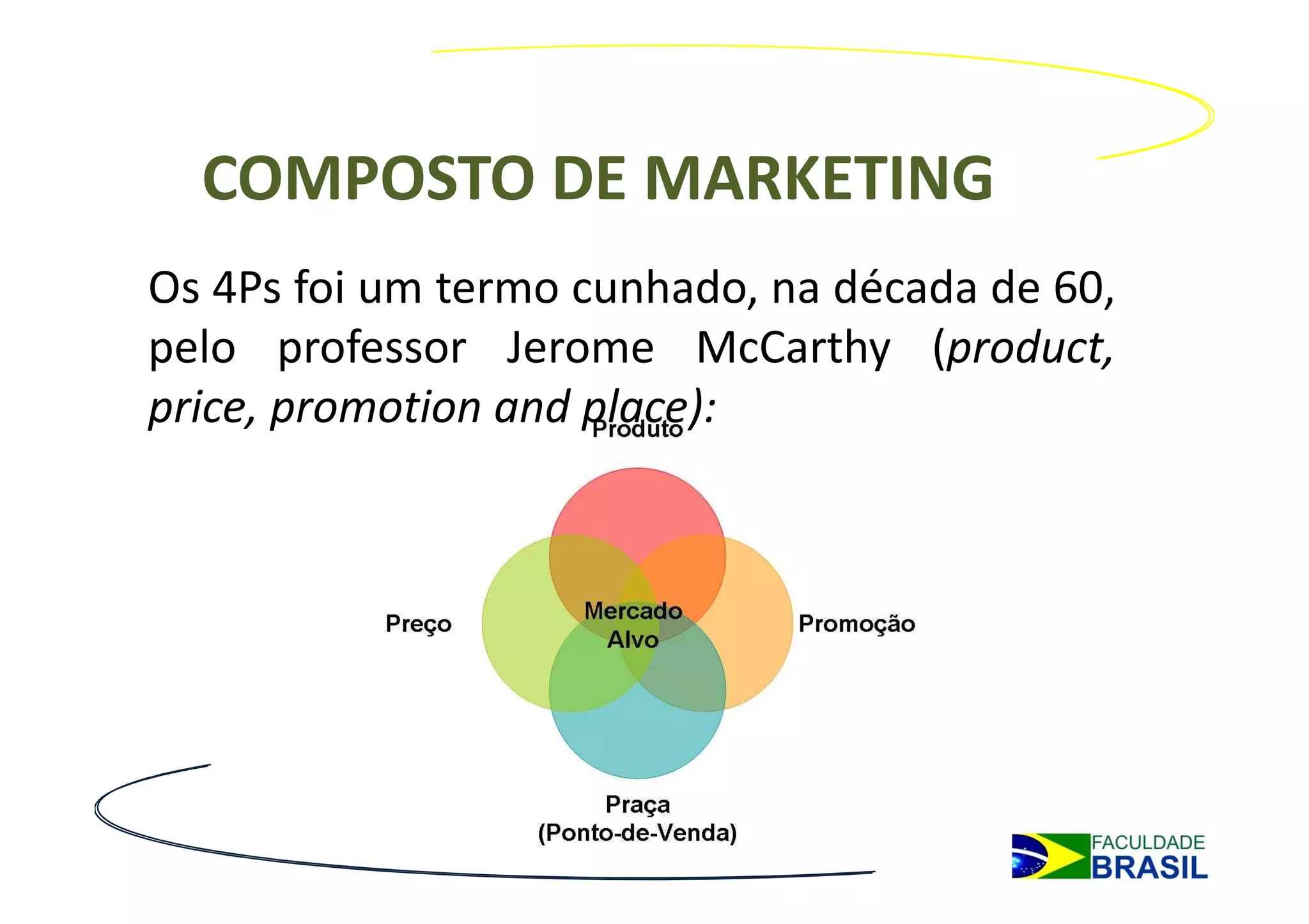 O documento discute conceitos fundamentais de marketing, incluindo os 4Ps (produto, preço, promoção e lugar), níveis de produto, classificação de produtos, decisões sobre produtos e o estabelecimento da marca. Os principais pontos abordados são a definição de produto, os diferentes níveis de produto, como tangibilidade, uso e durabilidade classificam os produtos, e como elementos como nome, logotipo e slogan constroem o valor da marca.