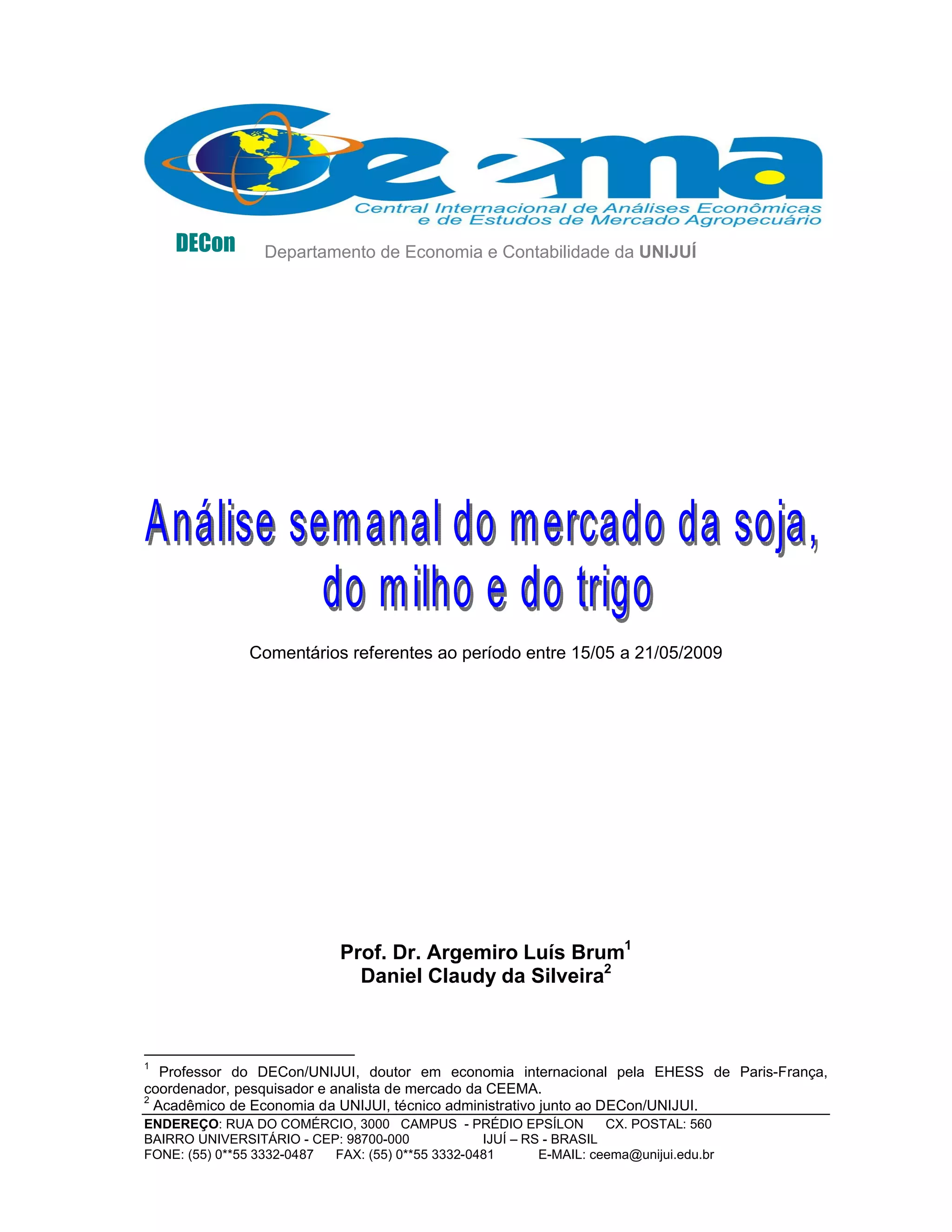 O documento resume as cotações de commodities agrícolas na Bolsa de Chicago e nos mercados brasileiros entre 15/05 e 21/05. As cotações da soja subiram levemente em Chicago, impulsionadas por estoques baixos e demanda da China. No Brasil, os preços também aumentaram apesar da queda do câmbio, mantendo-se em níveis elevados. A colheita da soja no país chegou a 98% da área total.
