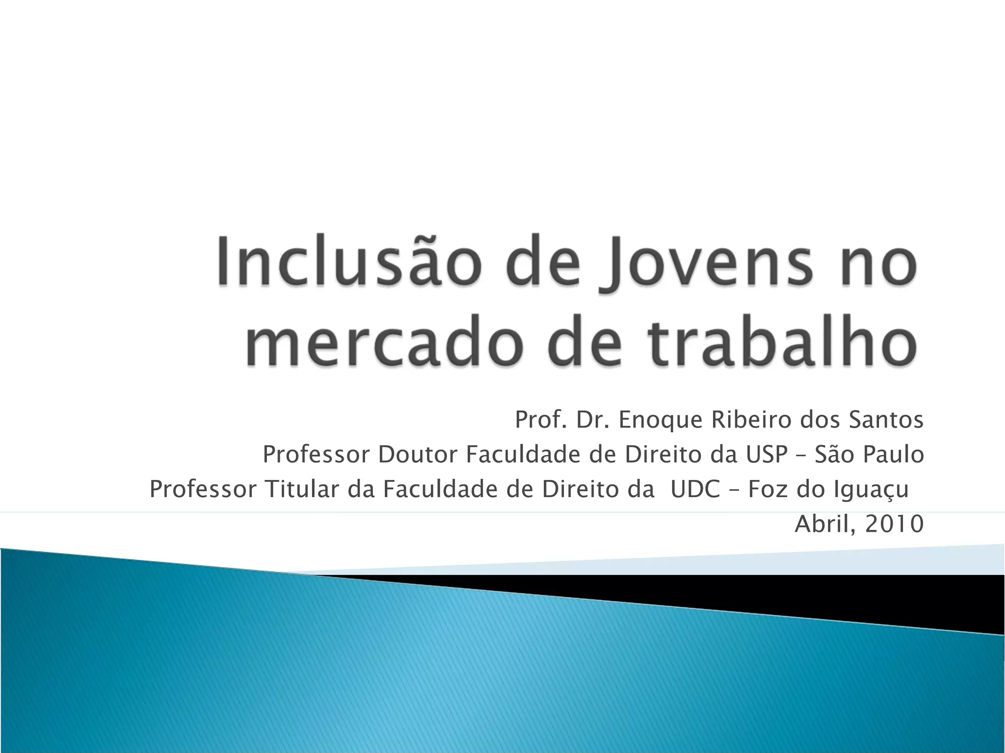 O documento discute os desafios do mercado de trabalho para os jovens na América Latina, como o alto desemprego juvenil e a informalidade. Também apresenta a legislação brasileira sobre a aprendizagem profissional como uma política pública importante para a inclusão dos jovens no mercado.