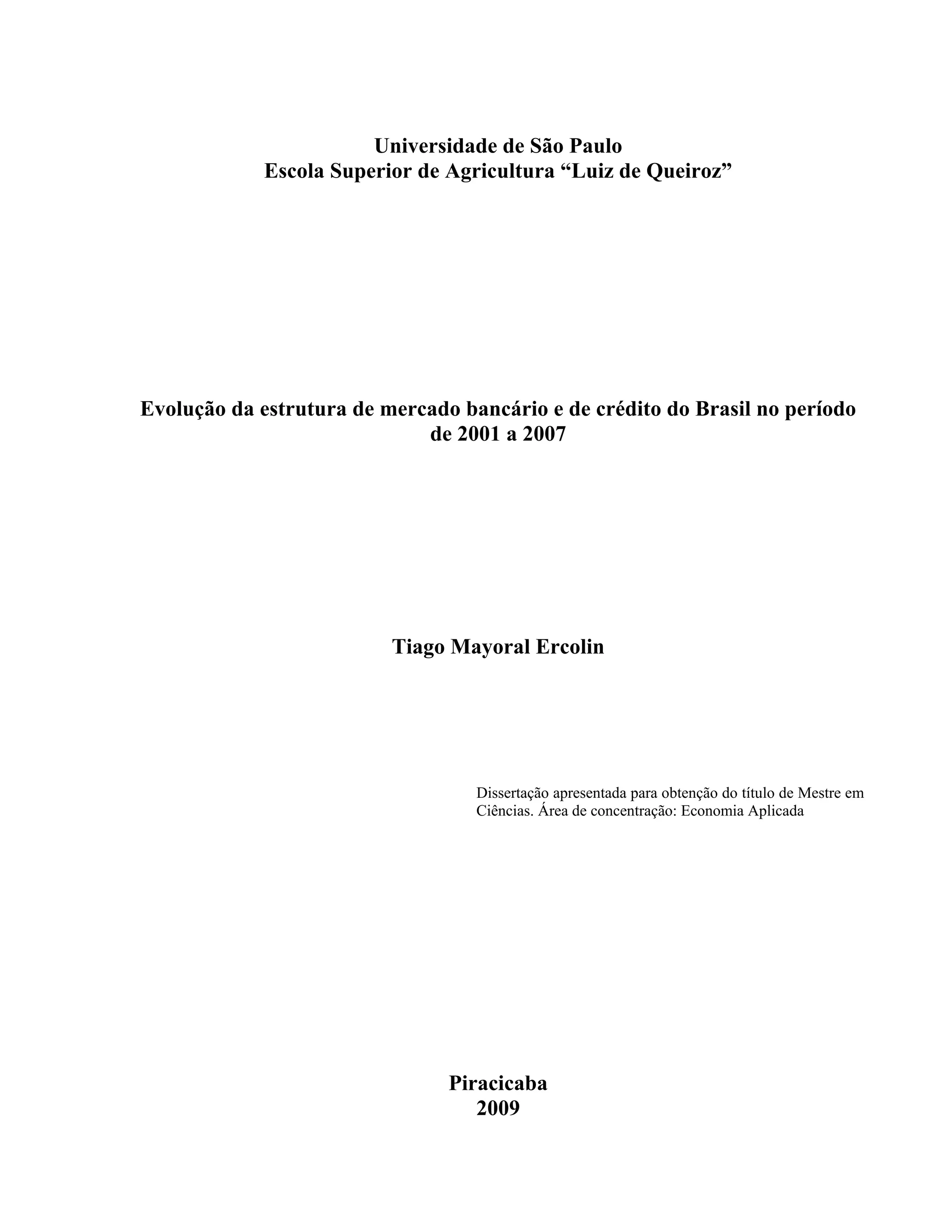 Este documento apresenta uma dissertação de mestrado sobre a evolução da estrutura dos mercados bancário e de crédito no Brasil no período de 2001 a 2007. Utilizando dados do Banco Central, calcula índices de concentração e desigualdade para diferentes contas desses mercados, com o objetivo de analisar se houve alterações nesses parâmetros ao longo do tempo.