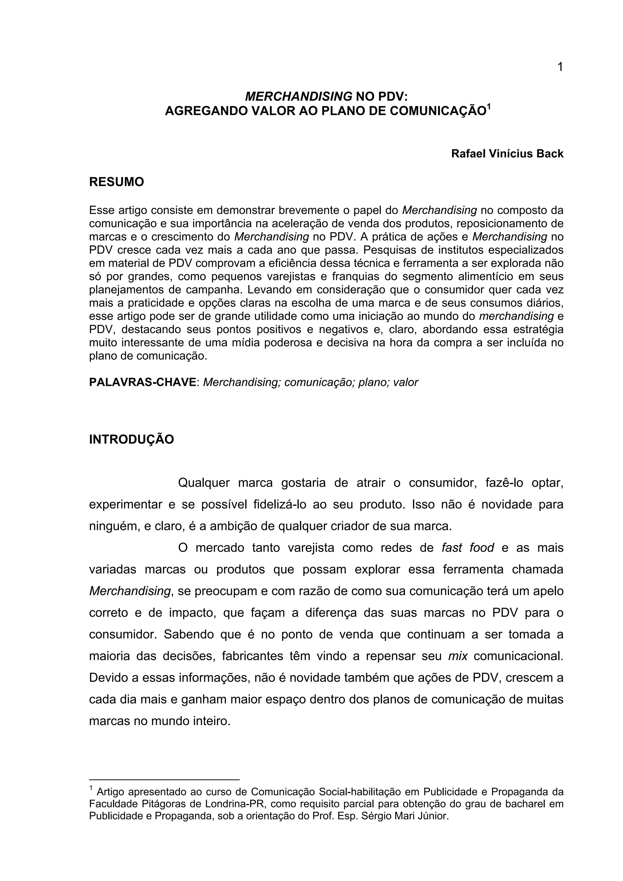1) O documento discute a importância do merchandising no ponto de venda (PDV) para agregar valor aos planos de comunicação de marcas. 2) Ele apresenta estudos que mostram que a maioria das decisões de compra são tomadas no PDV e que o merchandising no PDV tem se tornado cada vez mais comum. 3) O documento usa o exemplo da rede de fast food Rei do Mate para ilustrar como o merchandising no PDV pode ser usado de forma efetiva.
