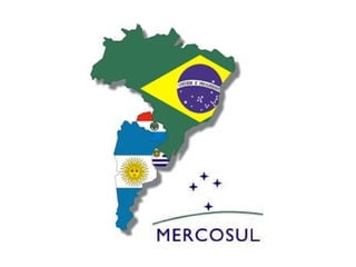 O Mercosul foi criado em 1991 por Argentina, Brasil, Paraguai e Uruguai para promover livre circulação de bens, serviços e estabelecer uma tarifa externa comum. O bloco busca harmonizar as leis dos países membros e possui Estados Associados como Bolívia, Chile, Colômbia, Equador e Peru.