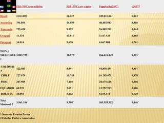O Mercosul é uma união aduaneira entre Argentina, Brasil, Paraguai e Uruguai que visa eliminar barreiras comerciais e fortalecer os países economicamente. Ele também tem planos de expandir a livre circulação de bens, serviços, pessoas e capitais entre os membros.