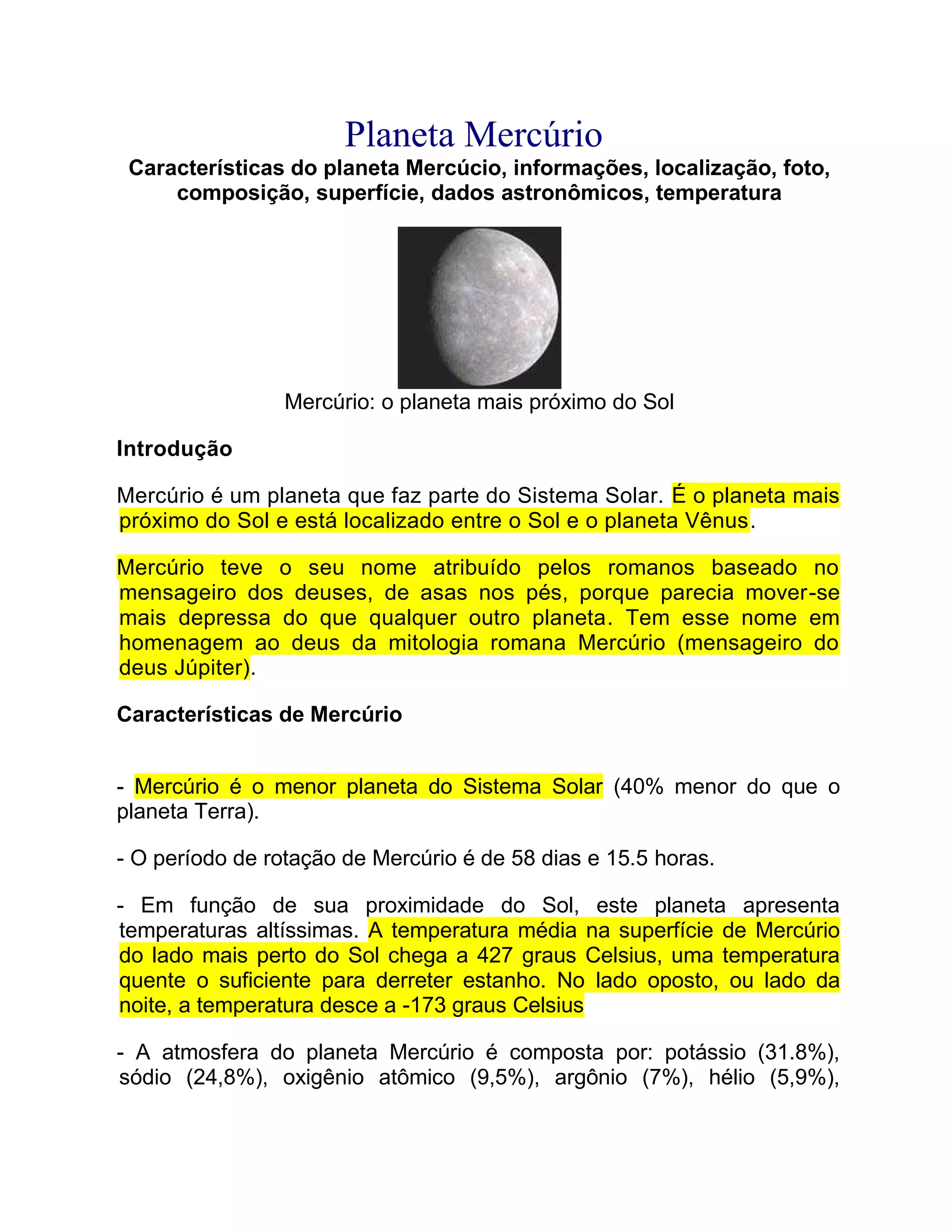 Mercúrio é o planeta mais próximo do Sol e o menor do Sistema Solar. Sua superfície é marcada por crateras e planícies devido aos intensos bombardeios de meteoritos ao longo da história. As temperaturas em Mercúrio variam drasticamente, indo de 427°C do lado iluminado pelo Sol até -173°C no lado não iluminado.
