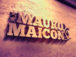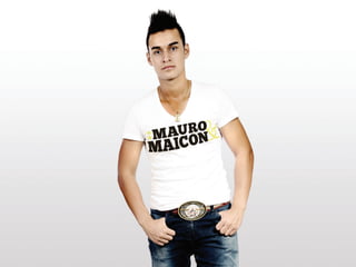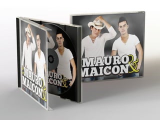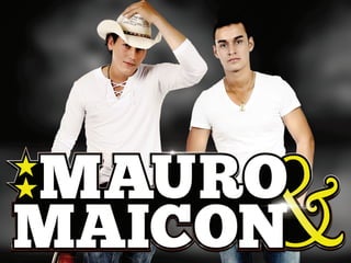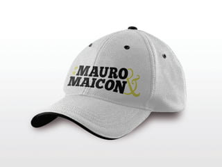 O documento apresenta o manual de identidade visual da dupla sertaneja Mauro e Maicon, descrevendo sua nova marca com conceito rústico e pop através da tipografia, cores e formas utilizadas. É apresentado exemplos de aplicações da marca em diferentes materiais como camiseta, boné, placa de aço e van.