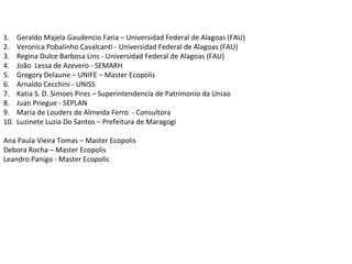 O documento discute os desafios de planejamento territorial, infraestrutura e desenvolvimento da Costa dos Corais. Apresenta 3 projetos-chave: 1) Comunicação, participação e empoderamento da população local; 2) Acordo territorial para integrar infraestrutura e serviços entre municípios; 3) Criação de espaços públicos de qualidade para estimular interação social e turismo.