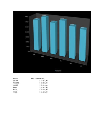 Este documento lista os preços de recibos para seis meses do ano, de janeiro a junho. Os preços variam de $56.192,00 em junho a $69.804,00 em fevereiro.