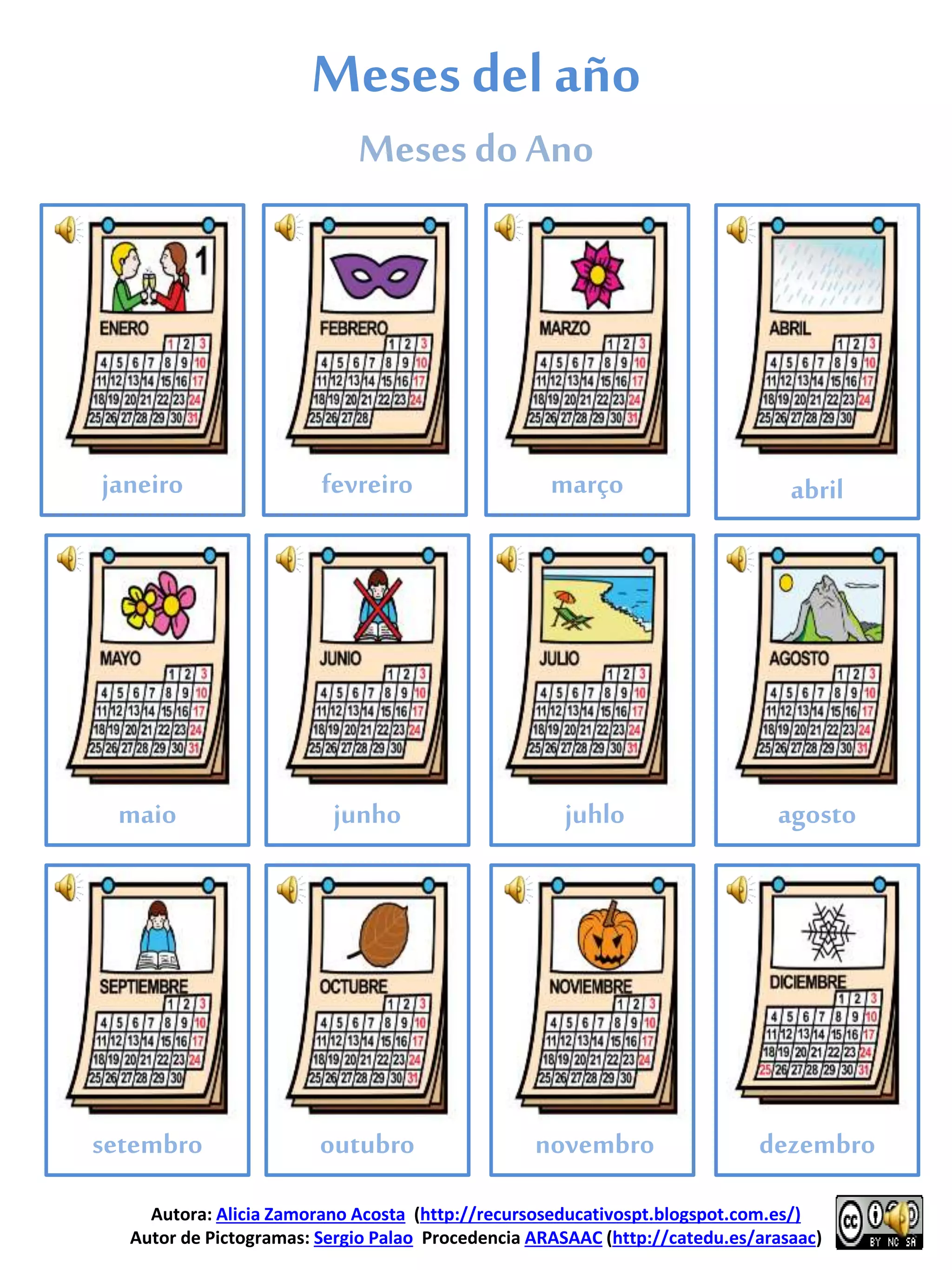 Os nomes dos meses do ano em português e espanhol são listados. Janeiro, fevereiro e março são os primeiros meses listados, seguidos por abril, maio, junho, julho e agosto. Setembro, outubro, novembro e dezembro completam a lista dos doze meses do ano.