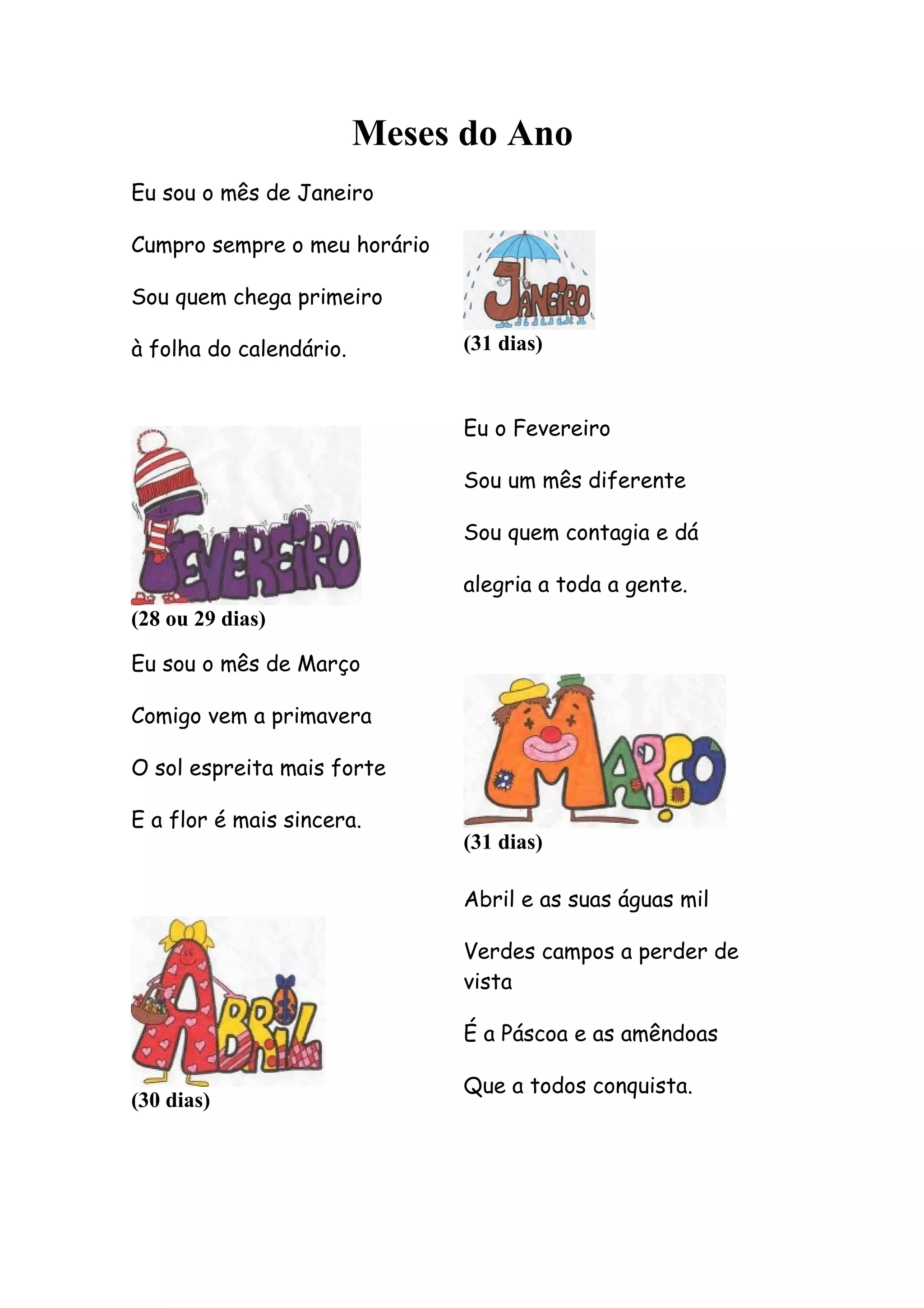 Este poema descreve cada um dos 12 meses do ano, destacando características climáticas, atividades típicas e datas comemorativas associadas a cada mês. Janeiro é o primeiro mês do ano. Fevereiro traz alegria. Março marca a chegada da primavera. Abril é associado à Páscoa.