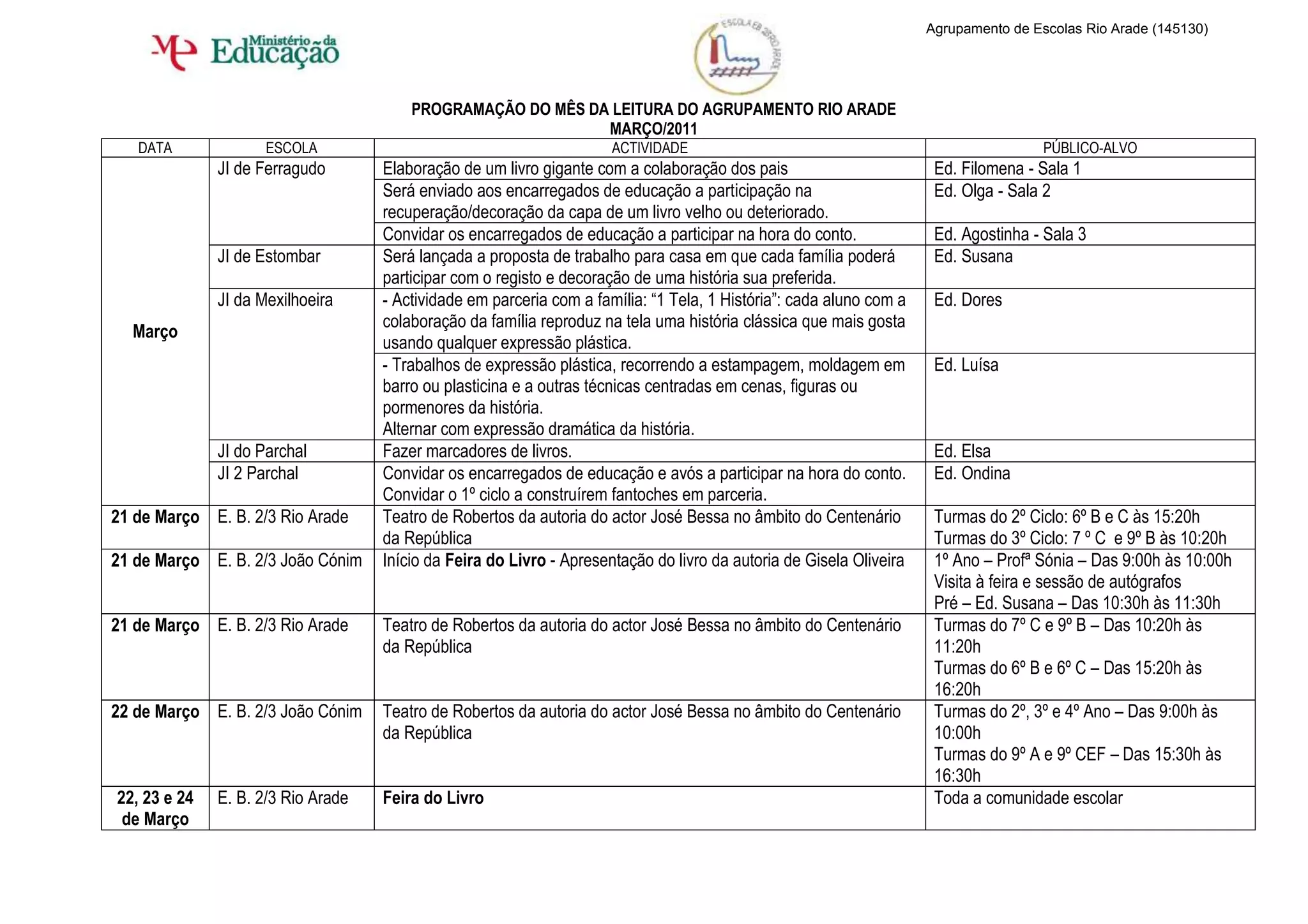 O documento apresenta a programação de atividades para o Mês da Leitura no Agrupamento Escolar Rio Arade em Março de 2011, incluindo teatro, feiras do livro, apresentações de livros, trabalhos manuais sobre histórias e poesias entre alunos, professores e pais.