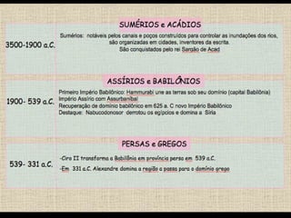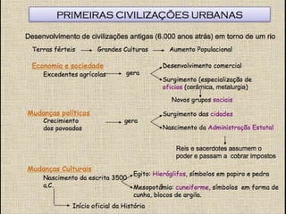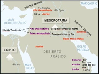 A Mesopotâmia era a região entre os rios Tigre e Eufrates, onde surgiram as primeiras civilizações baseadas na agricultura irrigada. Os sumérios desenvolveram a escrita cuneiforme e organizaram cidades-estado. Posteriormente, os babilônicos, como Hamurabi, e os assírios dominaram a região, estabelecendo códigos de leis e exércitos poderosos.