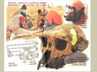 Restos de um hominídeo de 7 milhões de anos foram encontrados no Chade, o mais antigo representante da humanidade conhecido. A evolução humana começou com um ancestral comum há 33 milhões de anos, levando a vários hominídeos como o Australopitecus até 2 milhões de anos atrás. Entre 600.000 e 100.000 anos atrás existiram o Homo Sapiens Neandertalis e o Homo Sapiens Sapiens.