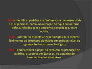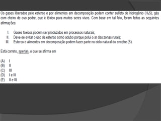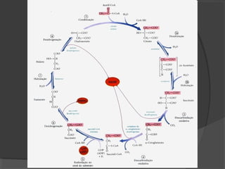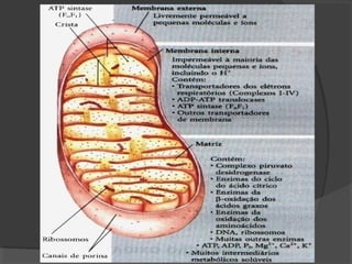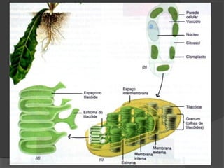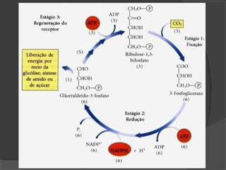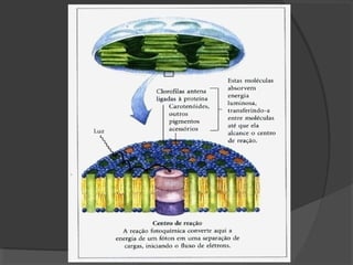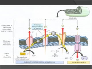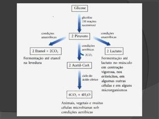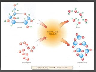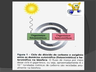 O documento discute os processos metabólicos de fotossíntese, respiração celular e quimiossíntese. Apresenta os principais componentes e reações envolvidas em cada processo, como a utilização da energia luminosa na fotossíntese e de compostos químicos na quimiossíntese para a síntese de compostos orgânicos. Também explica a obtenção de energia a partir da oxidação de compostos na respiração celular aeróbia e anaeróbia.