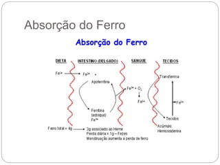 1) Ferro é um metal essencial para a síntese de hemoglobina e formação de hemácias e está presente em vegetais verdes, cereais, fígado e carnes vermelhas.