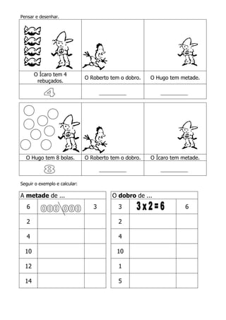 O documento ensina sobre cálculo da metade e do dobro de quantidades. Para calcular a metade de um número, divide-se o número por dois. Para calcular o dobro de um número, multiplica-se o número por dois. Exemplos ilustram como calcular a metade e o dobro de diferentes quantidades.