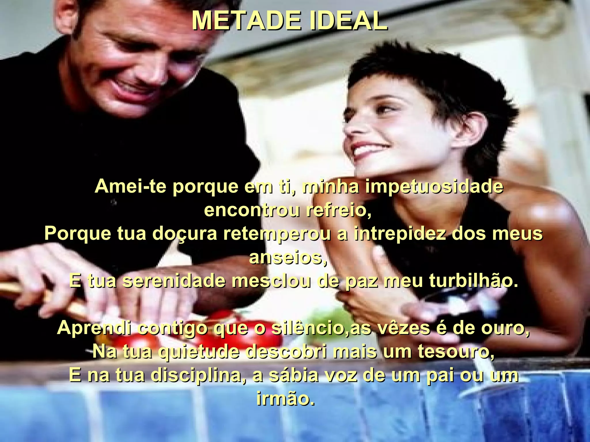 ![Já não questiono se tua ausência é um bem ou um mal. Apenas submeto-me passiva, ao traçado do meu destino Que aparta-me de ti e me priva da minha metade ideal. (Fátima Irene Pinto) Música: André Gagnon - Love me tender Montagem; [email_address] Visite o site www.fatimairene.com](https://image.slidesharecdn.com/metadeideal-090820142043-phpapp02/85/Metade-Ideal-3-320.jpg)