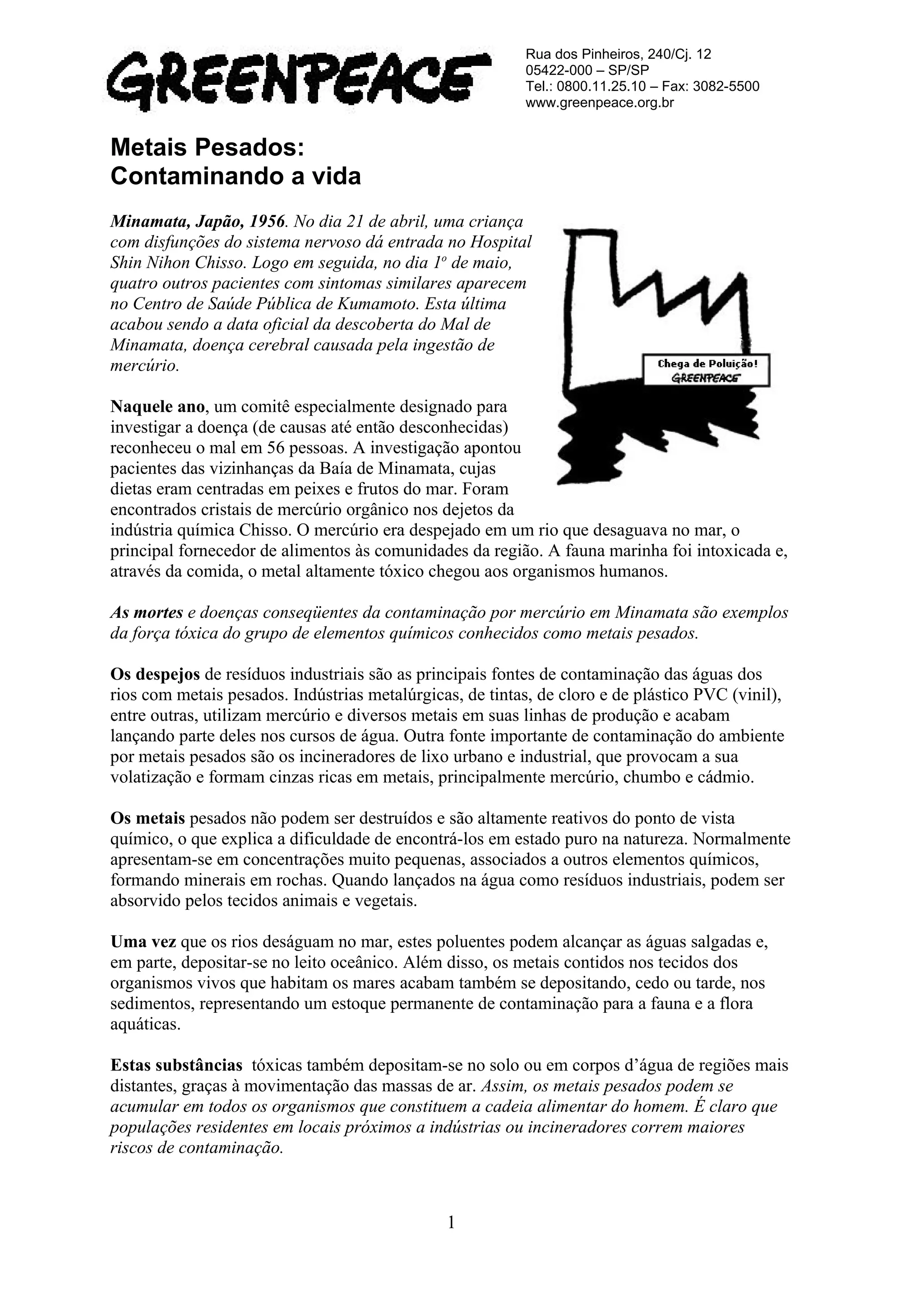 O documento discute a contaminação por metais pesados no meio ambiente, citando o caso de Minamata no Japão como exemplo dos efeitos tóxicos do mercúrio. Também explica que resíduos industriais e incineradores de lixo são as principais fontes de metais pesados nos rios e oceanos, podendo assim contaminar a cadeia alimentar e causar problemas de saúde.