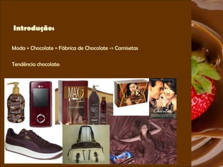 O documento descreve o planejamento de marketing de uma nova marca de camisetas chamada "Fábrica de Chocolate", destinada ao público feminino. A marca irá vender camisetas com estampas e aromas de chocolate para atrair "chocólatras". A loja será decorada como uma fábrica de chocolate e estará localizada em um shopping de Porto Alegre. As camisetas custarão entre R$35-65 e terão como objetivo proporcionar realização e paixão às clientes.