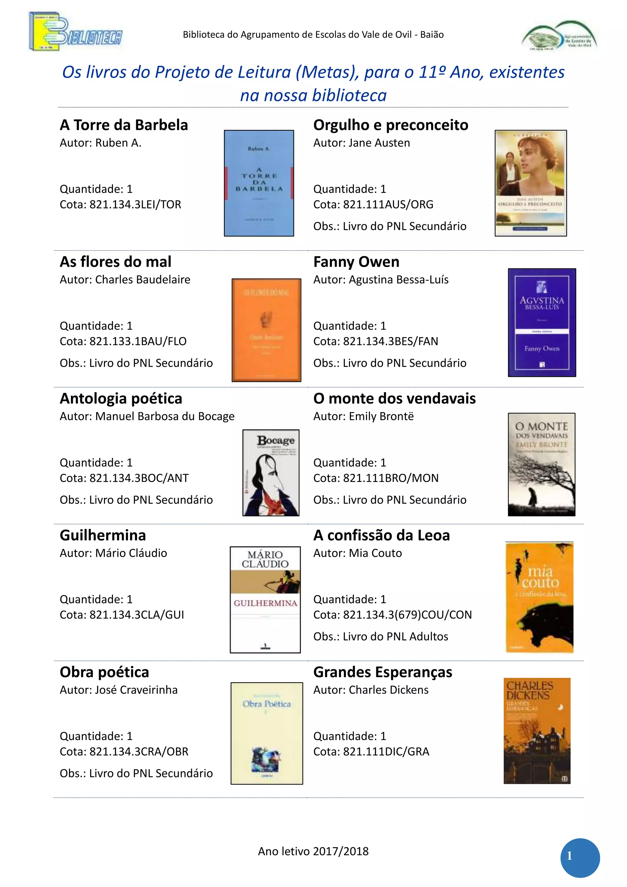 Este documento lista os livros disponíveis na biblioteca de uma escola secundária para o 11o ano, incluindo títulos, autores e quantidades. A lista inclui 47 obras literárias de autores portugueses e estrangeiros, algumas das quais também estão disponíveis em formato digital.