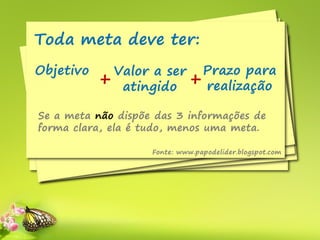 O documento discute o que são metas e como definir e alcançar metas eficazmente. Ele explica que metas devem ser específicas, mensuráveis e ter um prazo definido. Além disso, o documento fornece dicas como traçar um plano de ação, avaliar progresso, remover obstáculos e persistir até alcançar as metas.