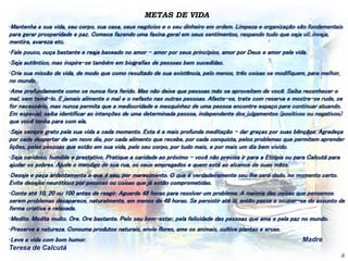 Este documento fornece metas de vida para prosperidade, paz e felicidade. Ele recomenda manter a vida organizada, falar pouco e ouvir bastante, inspirar-se em pessoas de sucesso, criar uma missão de vida que melhore o mundo, ser grato, caridoso e prestativo, meditar e orar frequentemente, e levar a vida com bom humor.