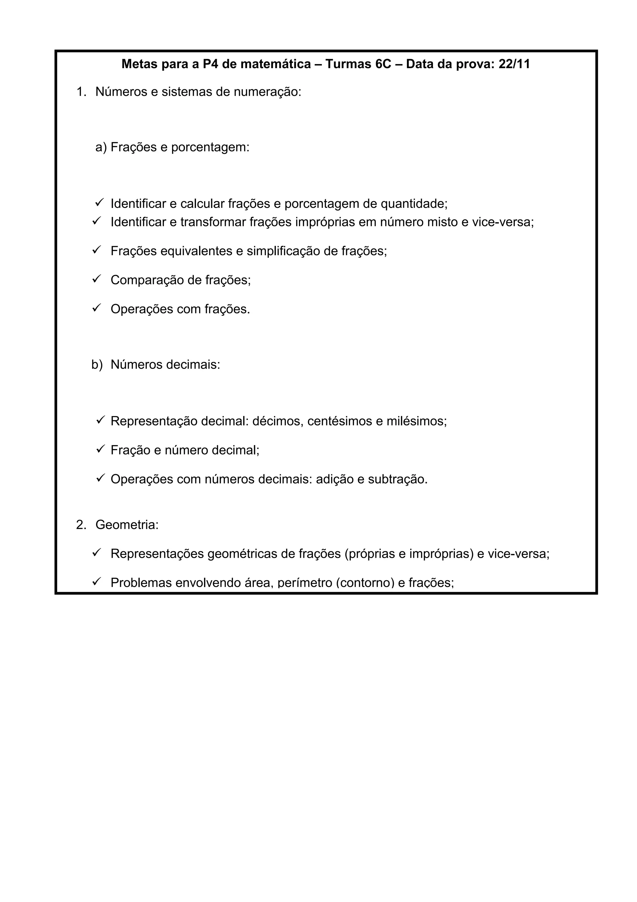 A prova de matemática da turma 6C em 22/11 abordará frações, porcentagens, números decimais e geometria. Os alunos precisam saber calcular e comparar frações, converter entre frações e decimais, e resolver problemas envolvendo áreas, perímetros e frações.