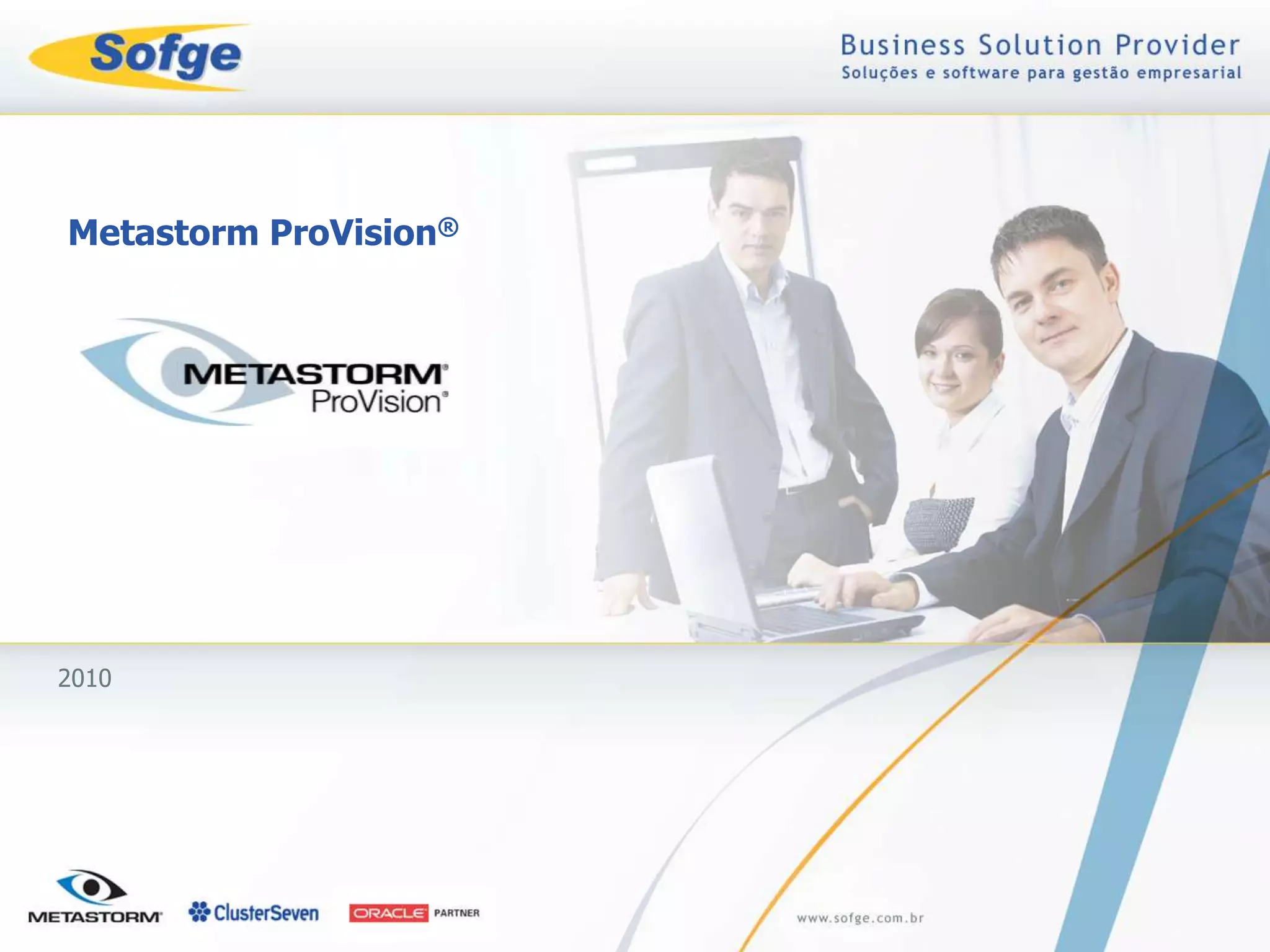 O documento descreve o Metastorm ProVision, uma ferramenta para documentação, análise e melhoria de processos de negócios distribuída na América do Sul pela SOFGE. A SOFGE oferece consultoria, treinamento, suporte técnico e monitoramento para uso adequado do ProVision. O ProVision permite modelagem abrangente dos processos de negócio de uma empresa para melhor compreensão e melhoria contínua.
