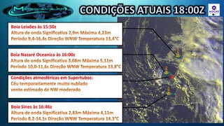 As boias de Leixões, Nazaré Oceanica e Sines registraram condições marítimas às 15:50, 16:00 e 16:46 respectivamente. Condições atmosféricas em Supertubos não foram especificadas.
