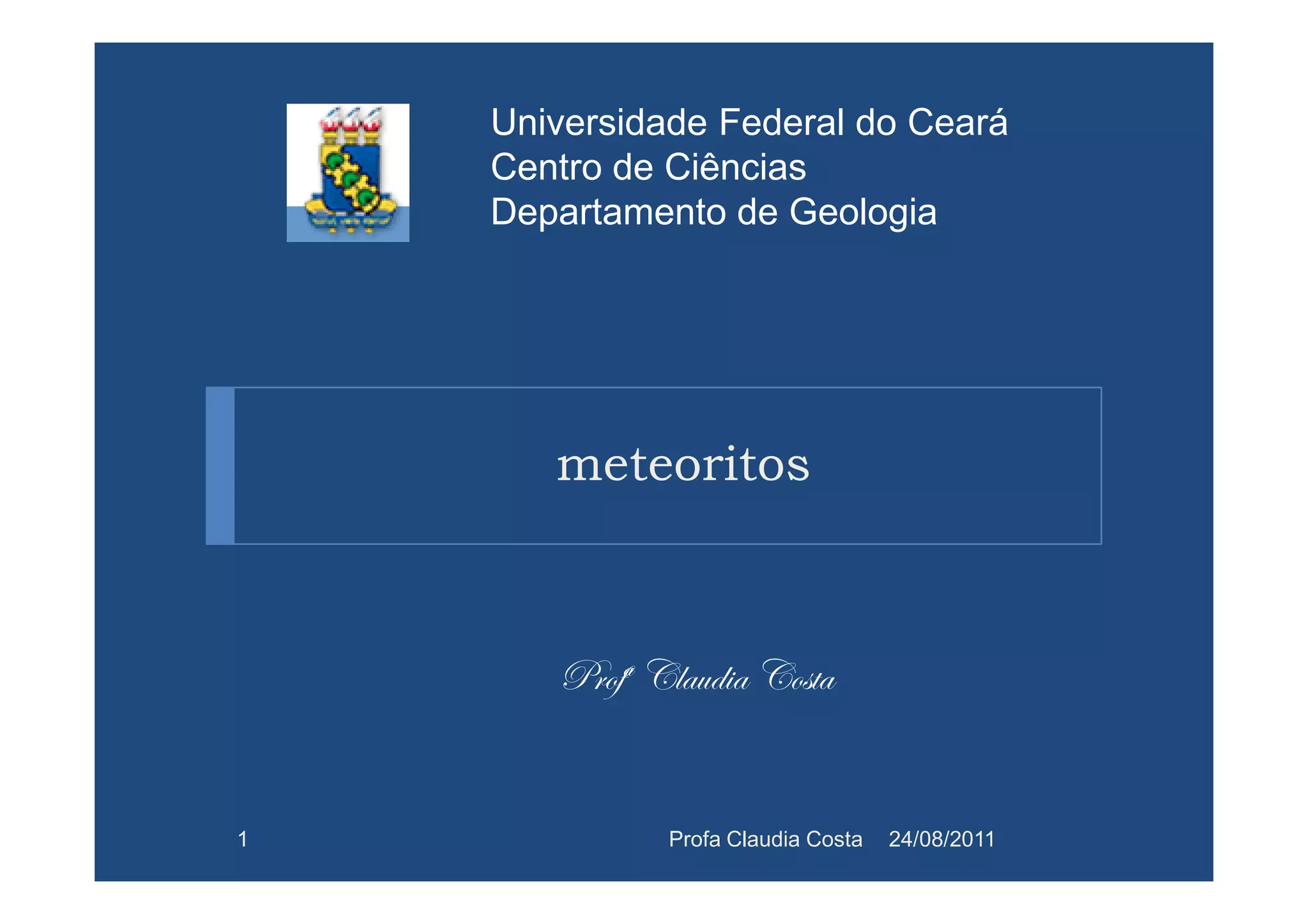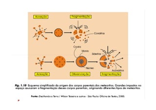 Os meteoritos são fragmentos de matéria sólida provenientes do espaço. Eles podem ser classificados como condritos, acondritos ou meteoritos metálicos de acordo com sua estrutura, composição e origem. O estudo dos meteoritos fornece informações importantes sobre a formação e evolução primitiva do Sistema Solar e da Terra.
