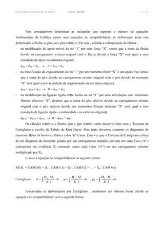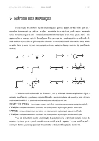 O documento descreve o método dos esforços para resolver estruturas hiperestáticas. O método envolve substituir vínculos por carregamentos externos para criar uma estrutura equivalente isostática. As deformações da estrutura original e equivalente são igualadas através de equações de compatibilidade para determinar os esforços internos.