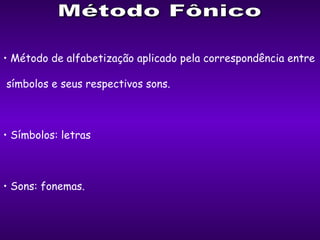 Método Fônico Métodode alfabetização aplicado pela correspondência entre símbolos e seus respectivos sons. Símbolos: letras Sons: fonemas.