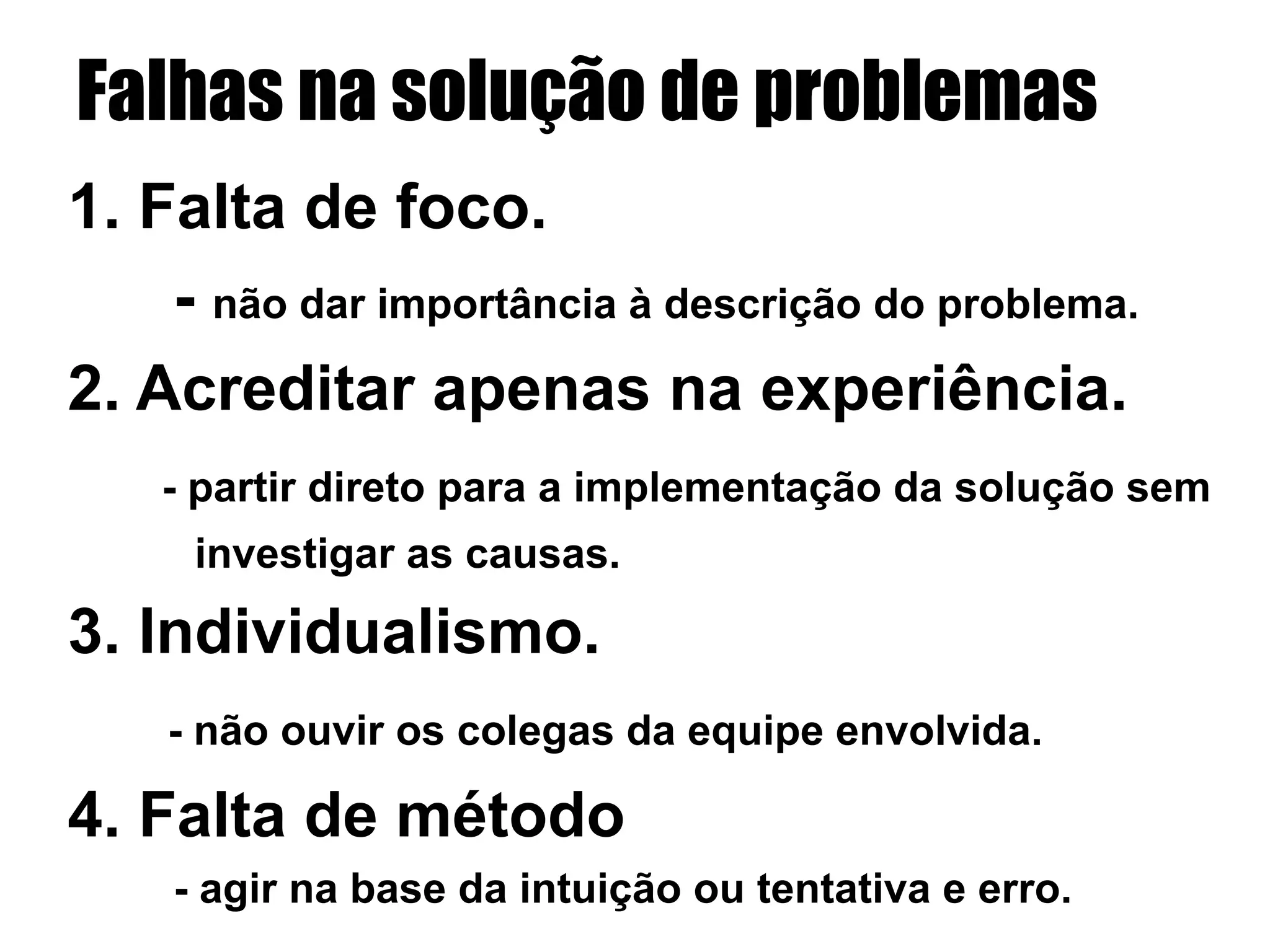 2) São listadas falhas comuns na solução de problemas, como falta de foco no problema, confiar apenas na experiência, não ouvir a equipe, e falta de método.