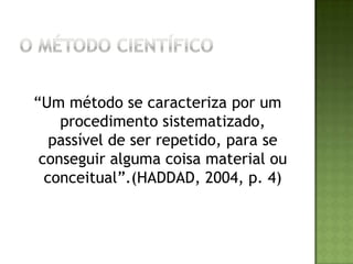 O documento descreve as principais etapas da metodologia científica e da pesquisa bibliográfica, incluindo a escolha do tema, elaboração do plano de trabalho, identificação e localização de informações, compilação, fichamento, análise e redação. Também apresenta a estrutura comum de trabalhos científicos, cobrindo introdução, revisão da literatura, material e métodos, resultados, discussão e conclusões.