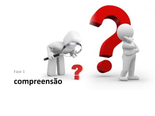 O documento descreve as fases de um projeto de design. A fase 1 compreende a pesquisa e análise da situação atual e problema. A fase 2 é a proposição, gerando conceitos e alternativas de solução. A fase 3 é a finalização com definição, mock-ups e resultados esperados.