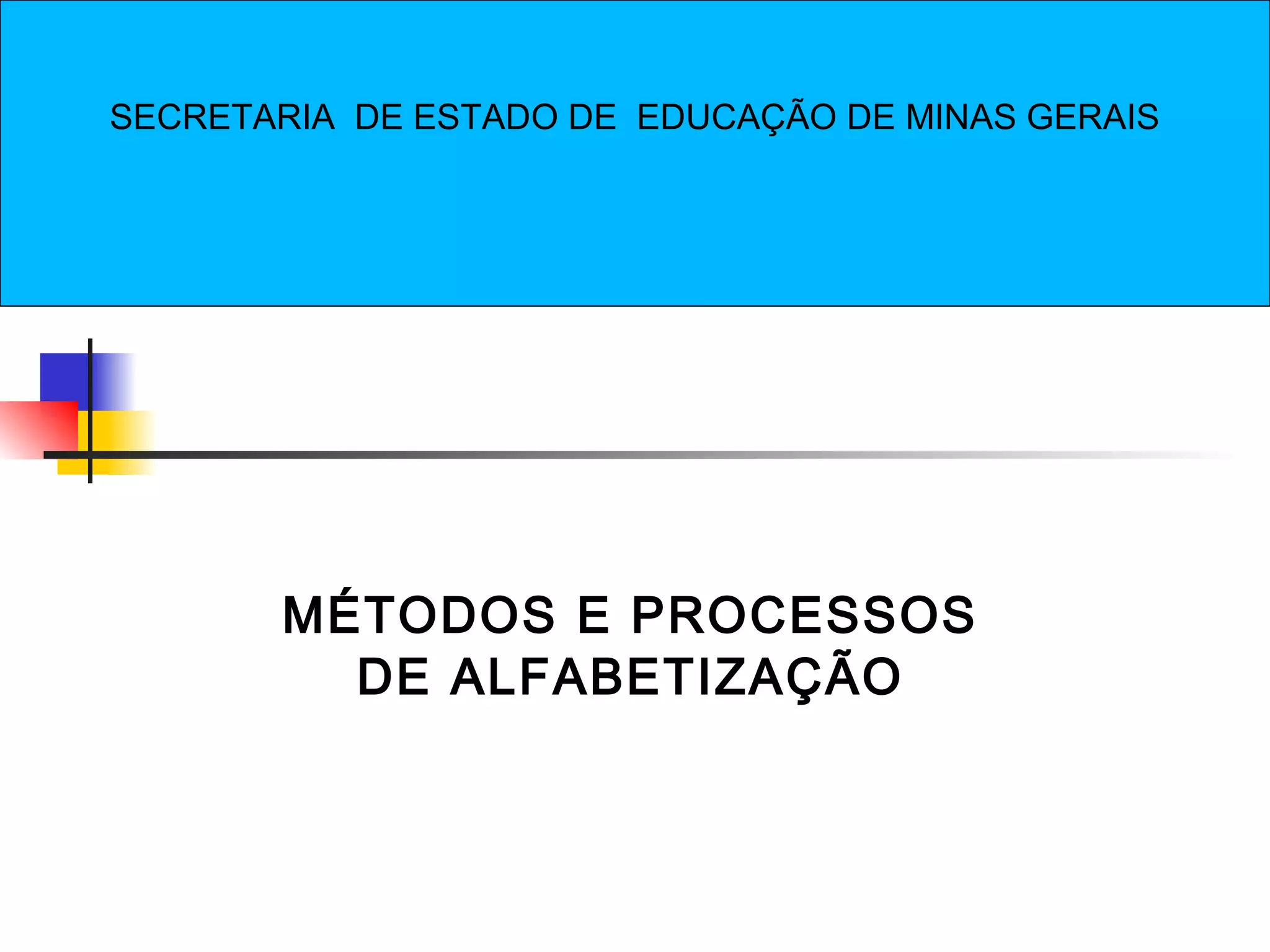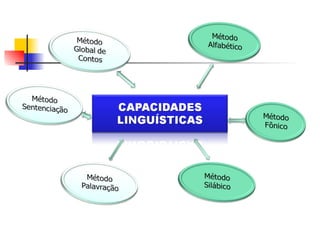 O documento descreve e compara diferentes métodos de alfabetização, incluindo métodos sintéticos (alfabético, silábico e fônico) e analíticos (palavração, sentenciação e global de textos/contos). Ele também discute a importância de considerar princípios teóricos, etapas de aplicação, material necessário e resultados esperados ao escolher um método, em vez de se concentrar apenas no método em si. Por fim, defende uma abordagem equilibrada e articulada que envolva princípios de